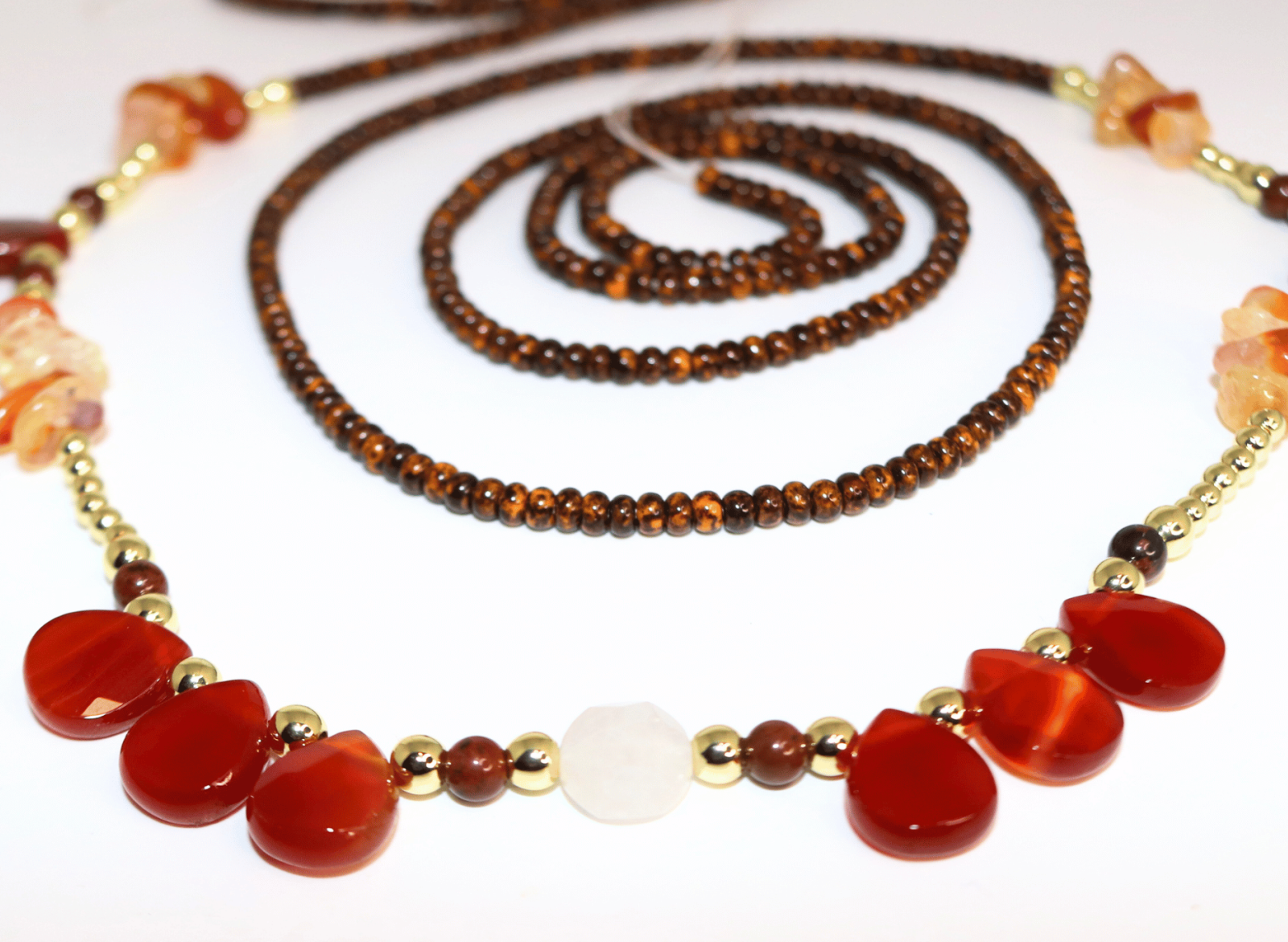 - Materials: Carnelian, moonstone, gold-filled accents, nylon-coated beading wire
