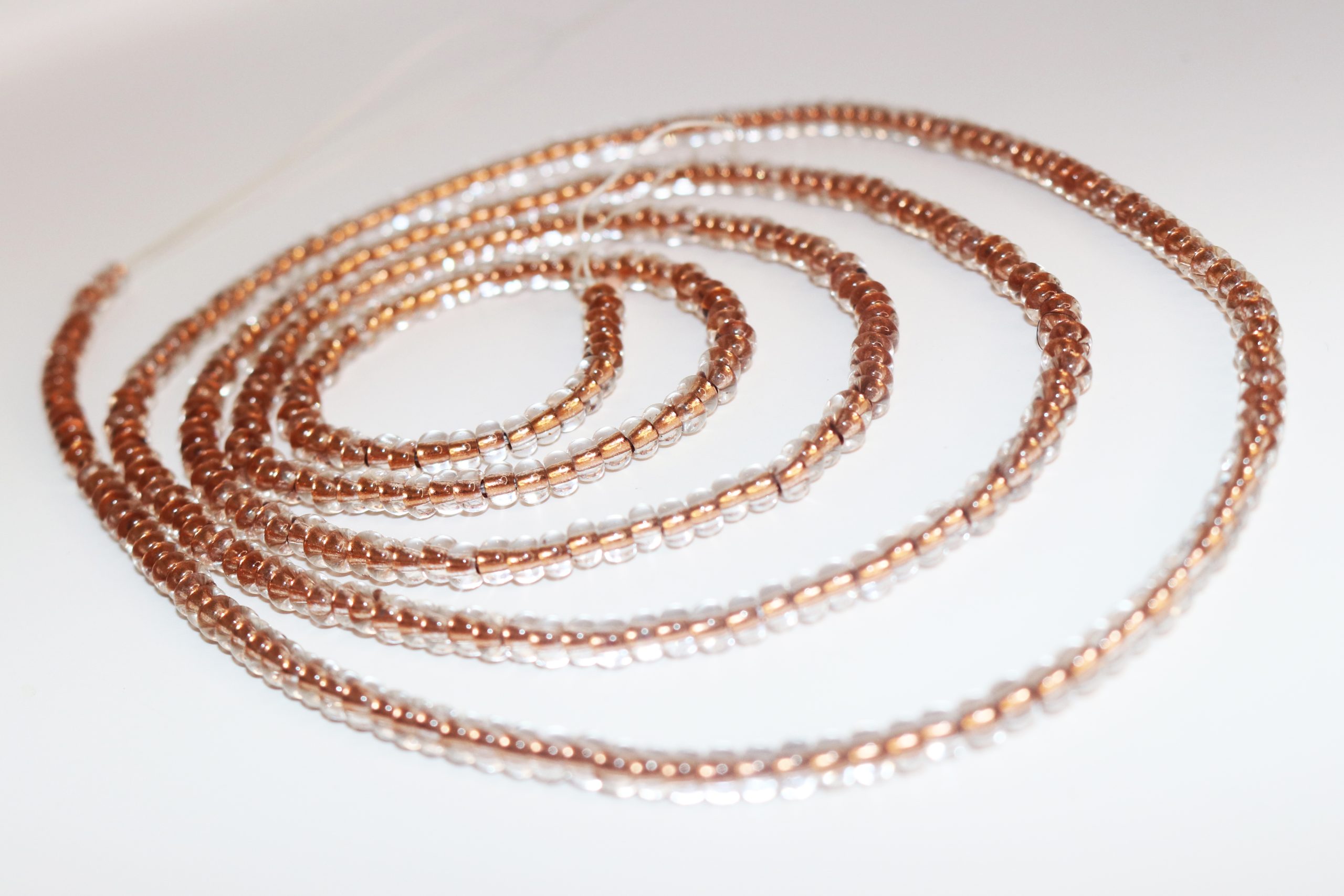 The warm rose gold tones carry the energy of self-worth, feminine strength, and grounded confidence. Copper is associated with conductivity and warmth — it channels and amplifies the energy you already carry. The translucent glass catches light and shifts between copper and blush, creating a strand that looks different depending on how you move. This is understated warmth — not asking to be seen, but impossible to miss.