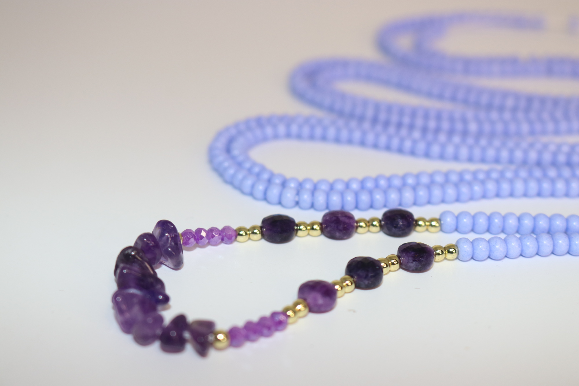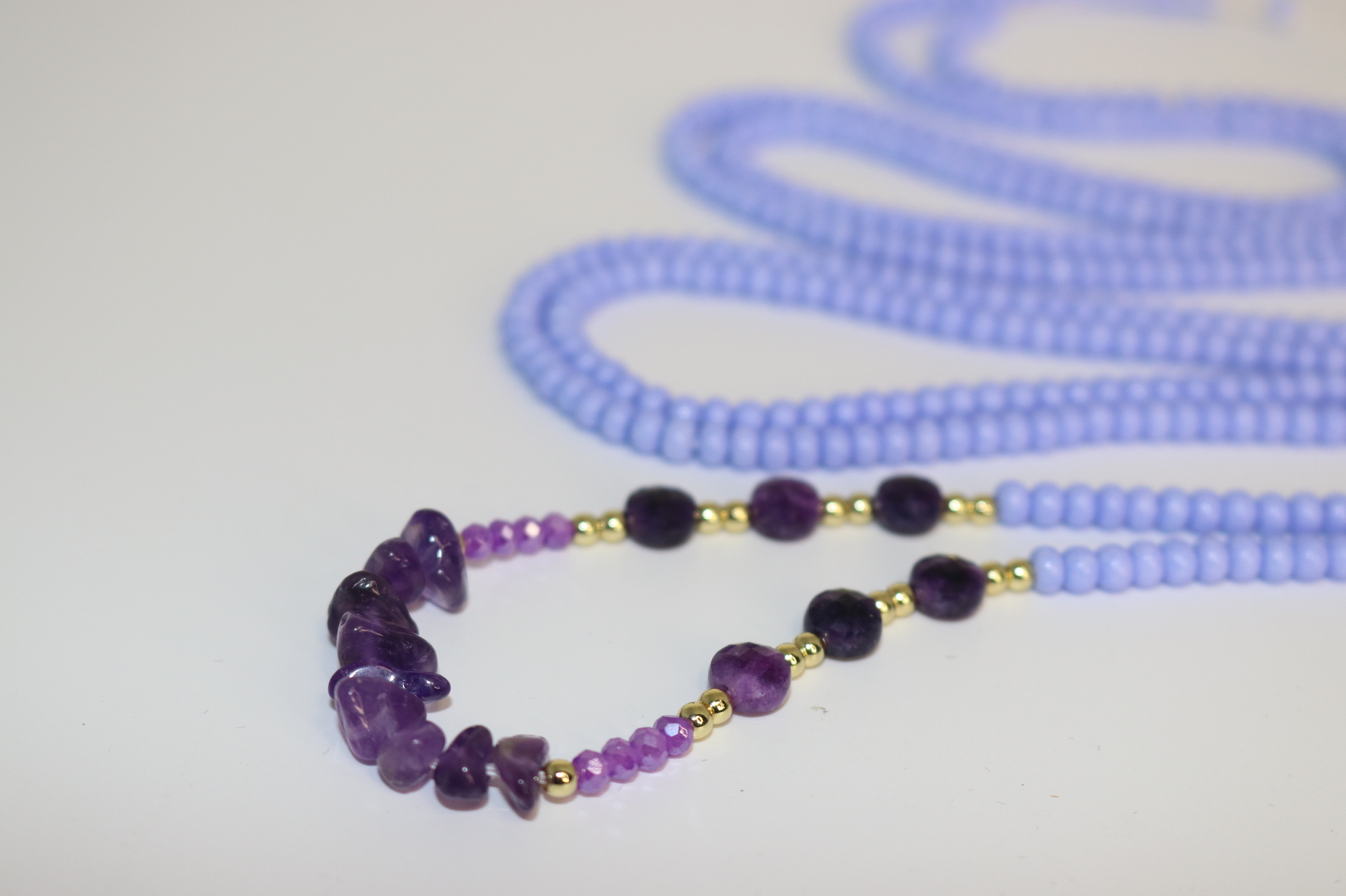 - Materials: Amethyst chips, faceted amethyst rondelles, amethyst ovals, gold-filled accents, periwinkle seed beads, nylon-coated beading wire