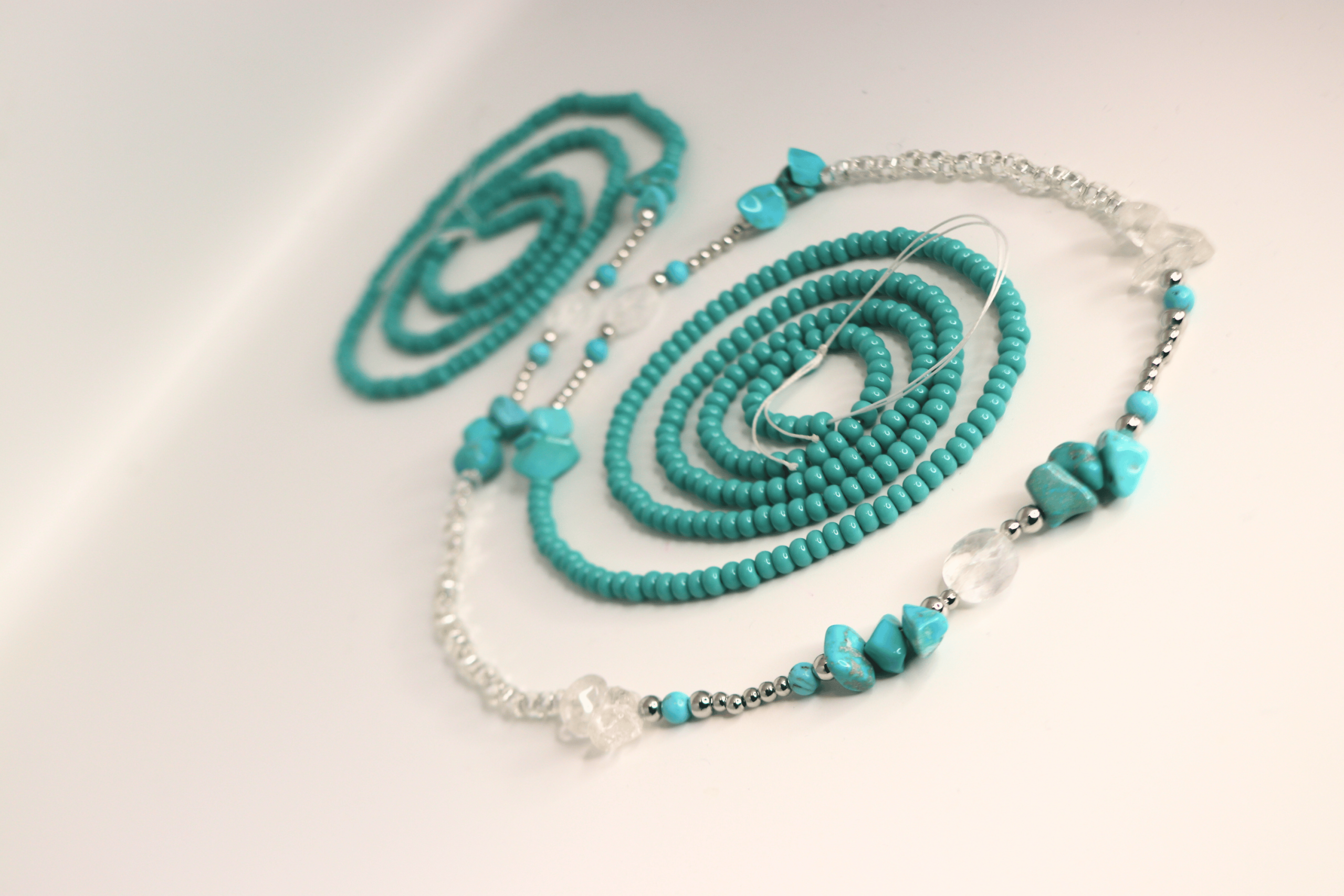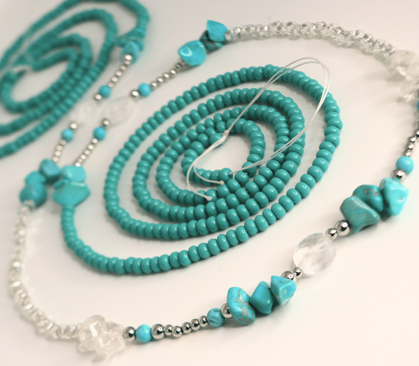 Unbounded is an intentionally designed waist bead strand crafted with turquoise, clear quartz, and white gold accents, chosen to support energetic flow, emotional release, and personal expansion.